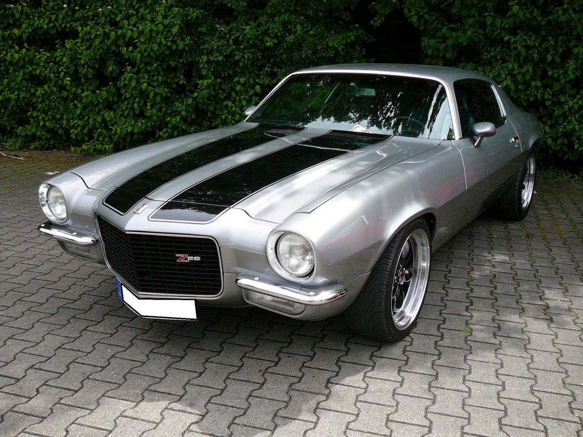 Chevrolet Camaro Z28 der Modelljahre 1970 und 1971 im Farbton cortez silver. Der Z28 war eine besonders sportliche Ausstattungsvariante, die mit einem Aufpreis von US$ 573,00 auf den Grundpreis von US$ 2749,00 zu Buche schlug. Technische Besonderheit für das Modelljahr war, das der Camaro serienmäßig mit Scheibenbremsenausgerüstet wurde. Angetrieben werden die Z28 Modelle von einem V8-Motor mit einem Hubraum von 5733 cm³ und einer Leistung und einer Leistung von 350 PS. Oldtimertreffen in Bottrop im Juni 2015.