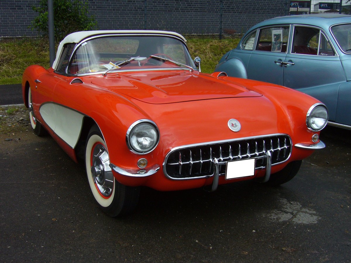 Chevrolet Corvette C1 des Modelljahres 1956. Das Jahr 1956 war das letzte Jahr der Corvette C1. Dieser im Farbton omaha orange lackierte C1 ist mit einem V8-Motor, der aus einem Hubraum von 4639 cm³ 223 PS leistet, ausgerüstet. Oldtimertreffen an der "Alten Dreherei" in Mülheim an der Ruhr am 15.06.2019.