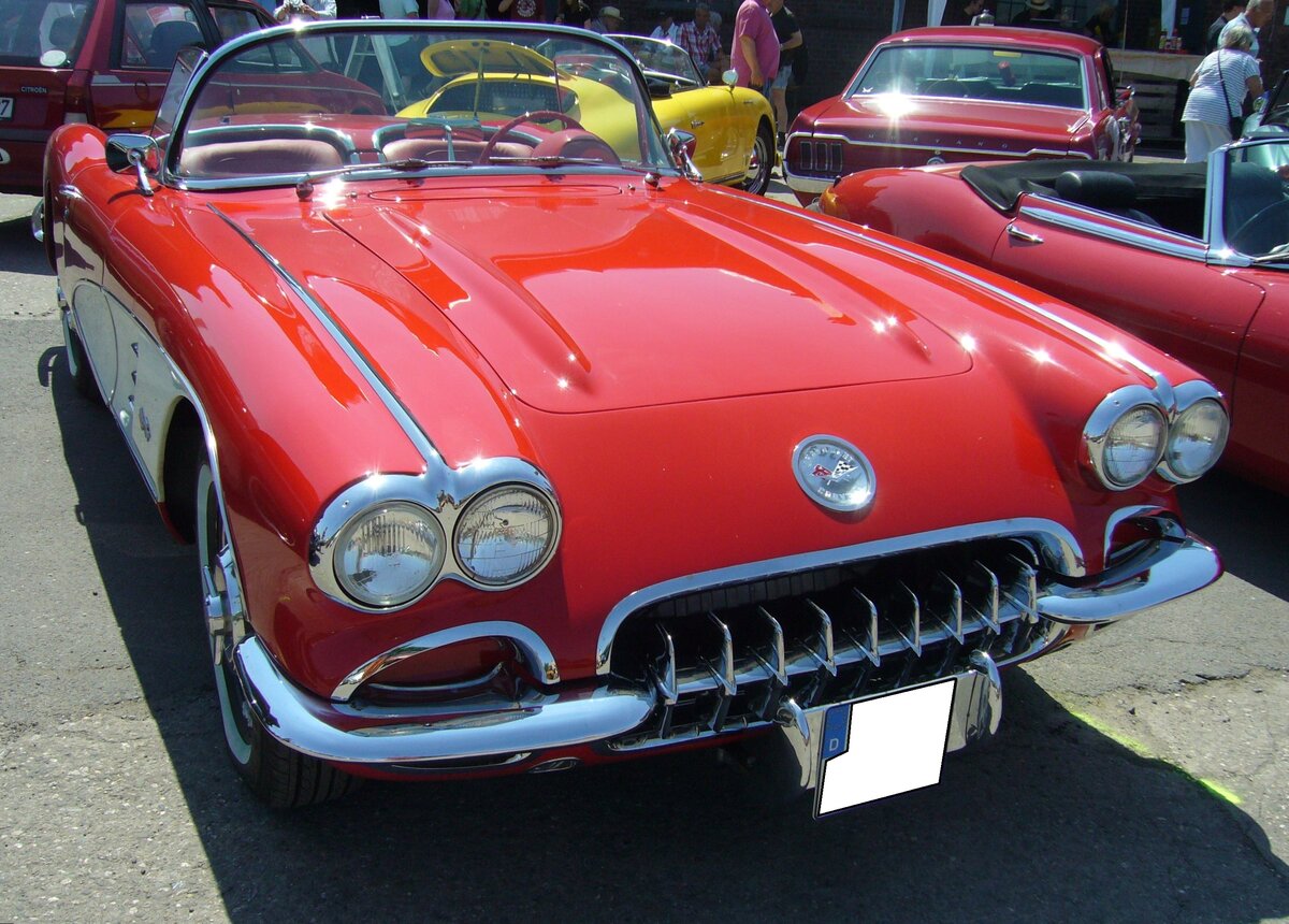 Chevrolet Corvette C1 des Modelljahres 1958. Die im Farbton signet red lackierte Corvette wird von einem V8-Motor angetrieben, der 250 PS aus einem Hubraum von 5692 cm³ leistet. Oldtimertreffen an der "Alten Dreherei" in Mülheim an der Ruhr am 17.06.2023.