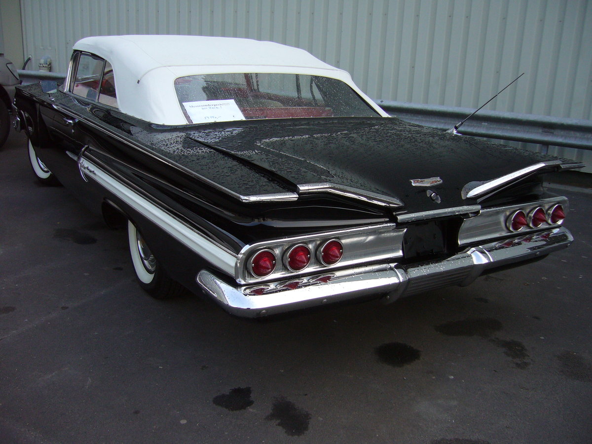 Chevrolet Impala Convertible aus dem Modelljahr 1960. Der im Farbton tuxedo black lackierte Impala wurde 1960 nach Belgien erst ausgeliefert. Im Jahr 1960 war die Baureihe Impala die mittlere Ausstattungsvariante. Darunter rangierte der Biscayne und darüber der Bel Air. Der V8-Motor hat einen Hubraum von 4638 cm³ und leistet 185 PS. Außengelände der Techno Classica Essen am 14.04.2019.
