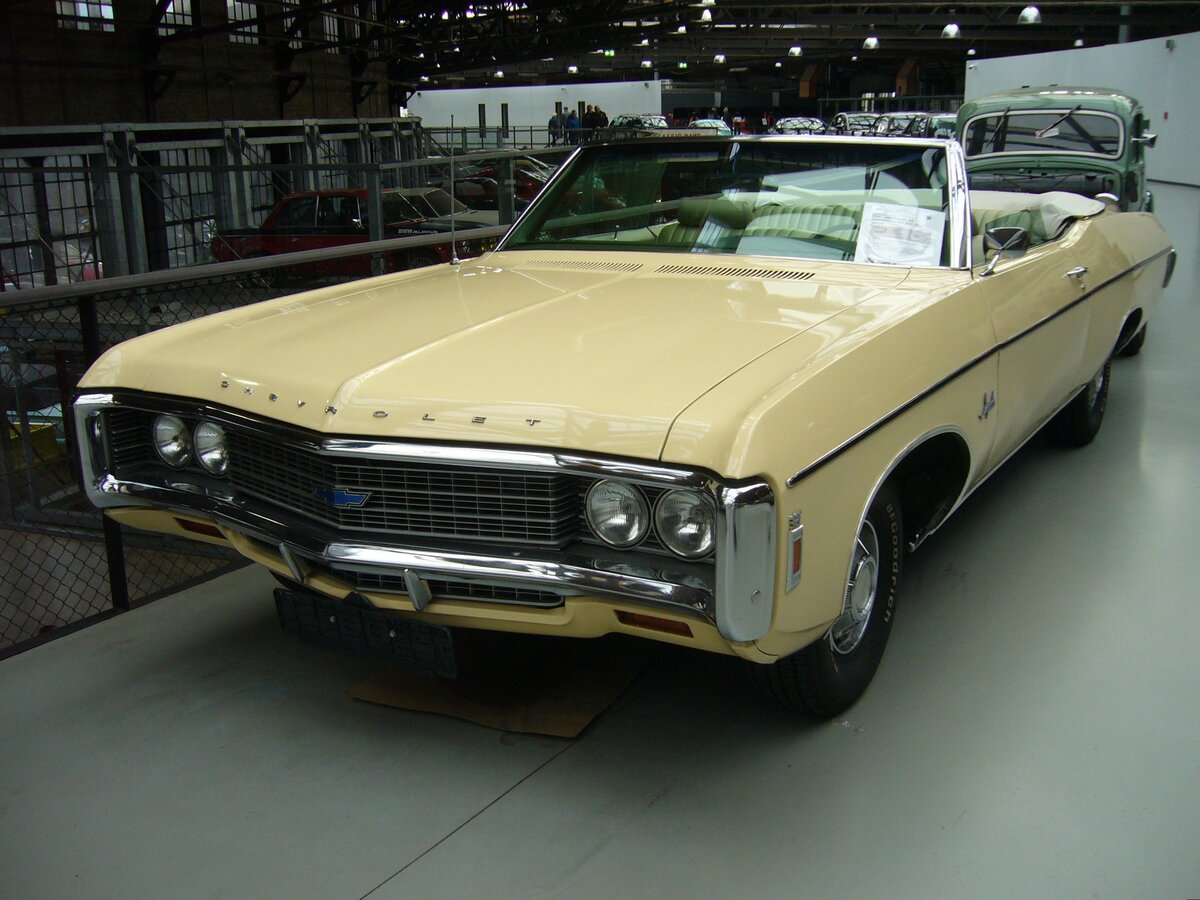 Chevrolet Impala Convertible aus dem Jahr 1969. Im Modelljahr 1969 bot Chevrolet neben den sportlichen Typen Camaro und Corvette zwei Modellreihen an: Den Impala und den etwas höherpreisigen Caprice. Beide Modellreihen waren mit folgenden Motorisierungen lieferbar: Sechszylinderreihenmotor mit 250 cui und 155 PS, sowie vier V8-Motoren mit 327 cui/235 PS, 350 cui/255 PS oder 300 PS, 396 cui/265 PS und sogar 427 cui/335 PS oder 390 PS. Das gezeigte Cabriolet im Farbton butternut yellow, ist mit dem kleinsten "Achtender 5358 cm³" ausgerüstet. Classic Remise Düsseldorf am 30.12.2022.