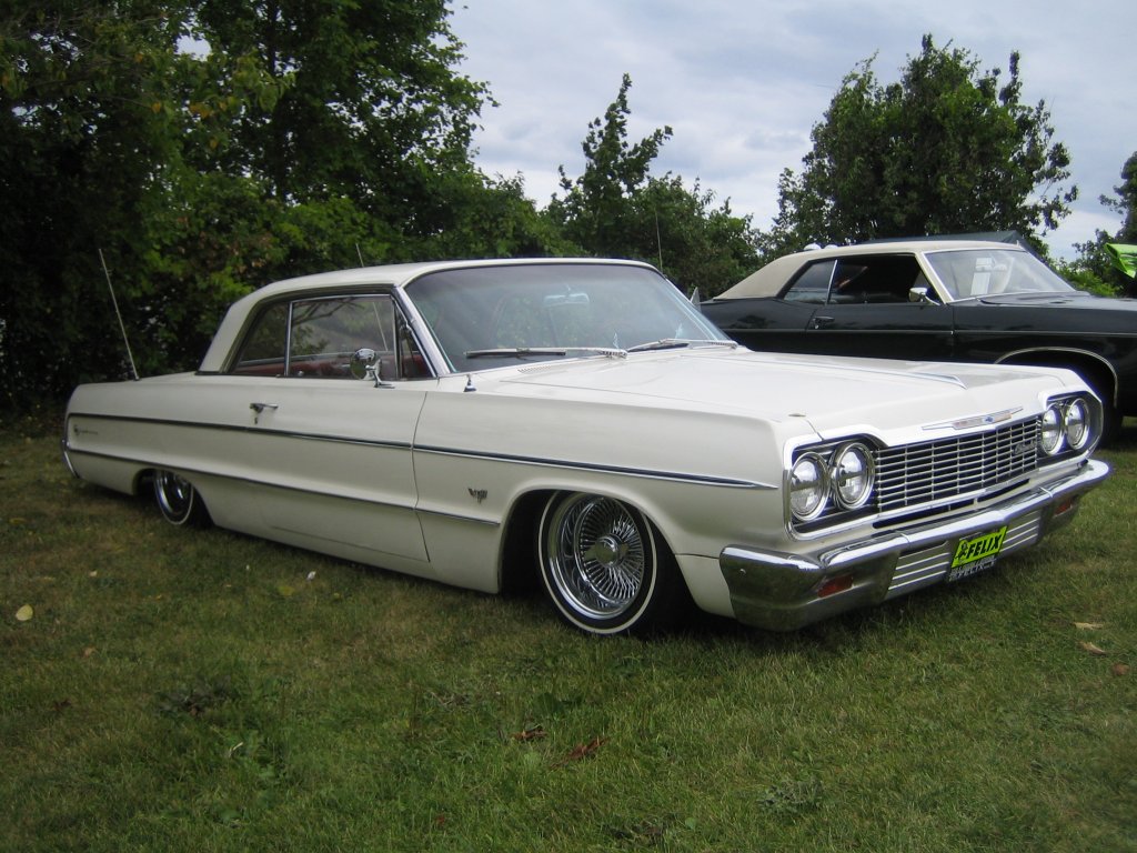Chevrolet Impala Sport Coupe des Modelljahres 1963. Der Wagen dürfte im Farbton cardinal red lackiert sein. Der Käufer/in konnte bei der Motorisierung zwischen zwei Sechszylinderreihenmotoren und sieben V8-Motorisierungen wählen. Der V8-Motor hat einen Hubraum von 6702 cm³ und leistet in der stärksten Version 425 PS. Den Verbrauch gab Chevrolet mit bis zu 24 Litern Benzin auf 100 Kilometer an. Classic car meeting in Abergavenny/South Wales am 25.05.2025. Michael H.