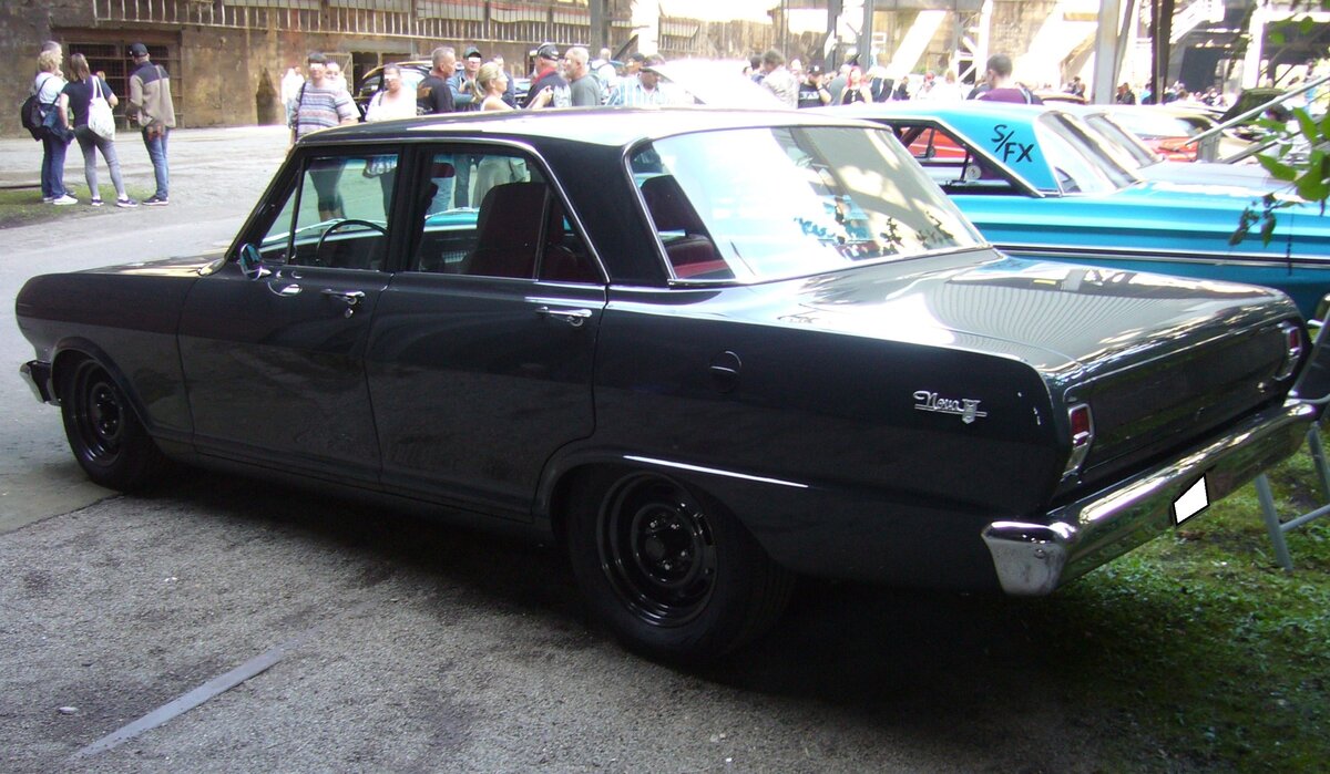 Chevrolet Nova Coupe im Farbton tuxedo black aus dem Jahr 1971. Der Nova, oder auch Chevrolet II genannte Wagen, war die Antwort von GM auf die Konkurrenz durch das Midsize-Modell Ford Falcon. Das Modell war als viertürige Limousine, Kombi und als Coupe (Foto) lieferbar. Standardmotorisierung war ein Sechszylinderreihenmotor mit einem Hubraum von 4093 cm³ und einer Leistung von 101 PS. Gegen Aufpreis konnte der Kunde etliche V8-Motoren bestellen. Toppmotorisierung war ein "Achtender" mit einem Hubraum von 5763 cm³ und einer Leistung von 245 PS. Oldtimer-Revival auf dem Gelände der Kokerei Zollverein in Essen am 28.07.2024.
