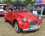 Citroen 2CV 6  Charleston Ente . Dieses Sondermodell wurde 1980 vorgestellt. Es war eine limitierte Stückzahl von 8000 Fahrzeugen geplant. Wegen der großen Nachfrage wurde das Modell aber dann doch ins Standardmodellprogramm von Citroen aufgenommen. Anfänglich wurde das Modell nur in der Lackierung rouge/delage-noir ausgeliefert. Später kam dann noch die gezeigte Farbkombination jaune helios/delage-noir hinzu. Neben geänderten Rückspiegeln hatte dieses Sondermodell auch innenliegende Scheibenbremsen an den Vorderrädern. Der luftgekühlte Zweizylinderboxermotor hat einen Hubraum von 602 cm³ und leistet 29 PS. Die Höchstgeschwindigkeit wurde mit 110 km/h angegeben. Classic car meeting in Melton Mowbray/GB am 10.08.2025.