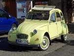 Citroen 2CV 6 Club aus dem Jahr 1979. Im französischen Original nannte sich der Farbton dieser "Ente" jaune cedrat. Der luftgekühlte Zweizylinderboxermotor hat in diesem Modell einen Hubraum von 602 cm³ und leistet 29 PS. September 2024 auf dem Besucherparkplatz eines Pubs in Pont-Neddfechan/South Wales.