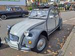 Citroen 2CV 6  Charleston Ente . Dieses Sondermodell wurde 1980 vorgestellt. Es war eine limitierte Stückzahl von 8000 Fahrzeugen geplant. Wegen der großen Nachfrage wurde das Modell aber dann doch ins Standardmodellprogramm von Citroen aufgenommen. Anfänglich wurde das Modell nur in einer rot-schwarzen Lackierung ausgeliefert. Später kam dann auch die gezeigte Farbkombination nachtgrau/kormorangrau hinzu. Neben geänderten Rückspiegeln hat dieses Sondermodell nun auch innenliegende Scheibenbremsen an den Vorderrädern. Der luftgekühlte Zweizylinderboxermotor hat einen Hubraum von 602 cm³ und leistet 29 PS. Die Höchstgeschwindigkeit wurde mit 110 km/h angegeben. Das gezeigte, rechts gelenkte,  Entlein  wurde im April 1986 erstmalig zugelassen. September 2024 auf dem Besucherparkplatz eines Pubs in Pont-Neddfechan/South Wales.