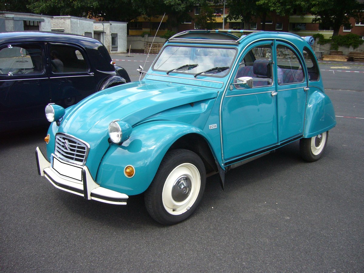 Citroen 2CV6 Club aus dem Jahr 1985. Es handelt sich hier um eine der letzten Ausbaustufen der unter dem Namen "Ente" bekannten Kultautos. Vorgestellt wurde die 2CV auf dem Pariser Autosalon des Jahres 1948. Die Produktion lief allerdings später an. Erst 1988 wurde die Produktion in Frankreich eingestellt. Im portugiesischen Werk sogar erst im Jahr 1990. Der gebläsegekühlte Zweizylinderboxermotor hat einen Hubraum von 602 cm³ und leistet 29 PS. Die Höchstgeschwindigkeit gab man mit 105 km/h an. Franzosentreffen an Mo´s Bikertreff in Krefeld am 11.07.2020.