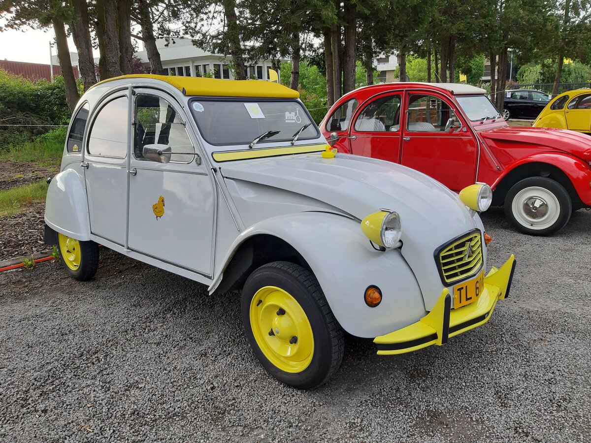 Citroen 2CV 6  Charleston Ente . Dieses Sondermodell wurde 1980 vorgestellt. Es war eine limitierte Stückzahl von 8000 Fahrzeugen geplant. Wegen der großen Nachfrage wurde das Modell aber dann doch ins Standardmodellprogramm von Citroen aufgenommen. Anfänglich wurde das Modell nur in der Lackierung rouge/delage-noir ausgeliefert. Später kam dann noch die gezeigte Farbkombination jaune helios/delage-noir hinzu. Neben geänderten Rückspiegeln hatte dieses Sondermodell auch innenliegende Scheibenbremsen an den Vorderrädern. Der luftgekühlte Zweizylinderboxermotor hat einen Hubraum von 602 cm³ und leistet 29 PS. Die Höchstgeschwindigkeit wurde mit 110 km/h angegeben. Classic car meeting in Melton Mowbray/GB am 10.08.2025.