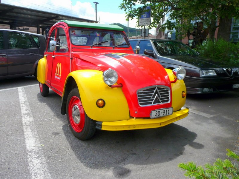 Citroen 2CV SO 911 mit Fastfood Werbung in Olten am 07.06.2009