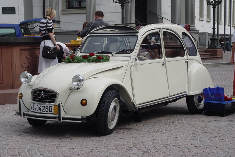 Am 30.07.2009 in Wiesbaden, vor dem alten Rathaus und Standesamt. Ein 2 CV als "Hochzeitskutsche" wartet er auf das frisch vermählte Paar.