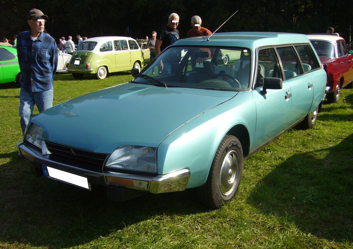 Citroen CX20 Break. Der Nachfolger der legendären ID/DS-Baureihe war ab Sommer 1974 lieferbar. und blieb bis Ostern 1991 in der Modellpalette von Citroen. Hier konnte ich einen CX Break (Kombimodell) der ersten Baureihe ablichten. Dieses ist an den Chromstoßstangen zu erkennen. Die Modelle der Basis-Baureihe CX20 haben einen Vierzylinderreihenmotor mit einem Hubraum von 1985 cm³ und einer Leistung von 102 PS. Die Höchstgeschwindigkeit für die Kombiversion  Break  gab das Werk für dieses Modell mit 175 km/h an. Damals, wie heute, gelingt es dem großen Gleiter viele in seinen Bann zu ziehen und zu faszinieren. Es mag Alternativen zum CX geben, aber sie sind im Ganzen gesehen nicht vergleichbar! Oldtimertreffen auf dem Gelände des Bikertreffs Mutter Vogel in Marl am 28.09.2025.