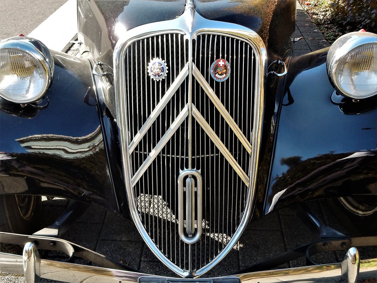 Citroën 11 CV Traction Avant, Teil der Frontansicht. Aufgenommen am 18. Oktober 2017