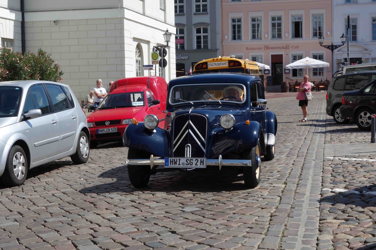 Citroen 11 CV als Brautwagen fährt am Standesamt von Wismar vor, August 2014