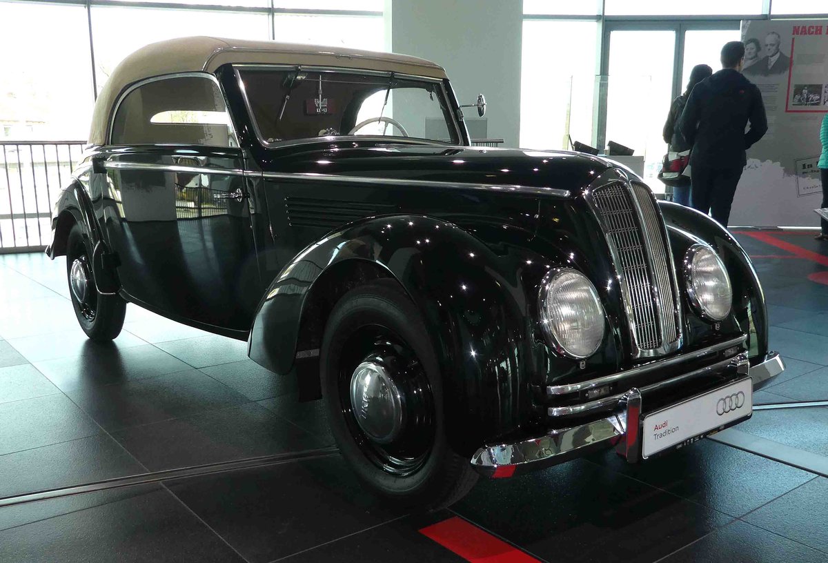 =DKW F 10 Cabriolet, Bj. 1950, 684 ccm, 20 PS, ausgestellt im Audi-Museum Ingolstadt im April 2019. Von diesem DKW F 10 wurden ingesamt 195 Cabriolets und Limousinen gefertigt.