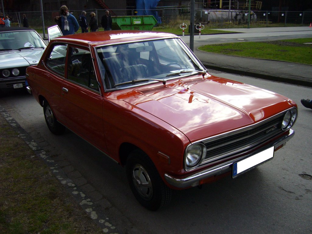 Datsun 1200 Limousine 2-türig (Pfadfinder). 1972 - 1974. Der Datsun 1200 war das erste Modell mit dem Datsun/Nissan auf dem deutschen Markt präsent wurde. Der 1.171 cm³ große 4-Zylinderreihenmotor leistet 54 PS. Oldtimertreffen Kokerei Zollverein am 01.04.2012.
