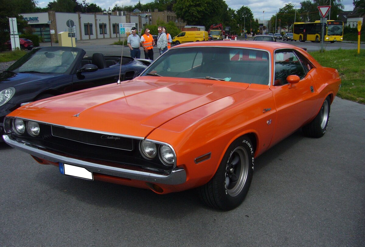 Dodge Challenger R/T aus dem Modelljahr 1971. Der sportliche Challenger kam 1969 auf den Markt und war als Coupe (Foto) und Convertible lieferbar. Der gezeigte Wagen gehört somit zur ersten Challenger-Generation. Ein solcher R/T war ab US$ 4009,00 zu haben. Der V8-Motor hat einen Hubraum von 383 cui und leistet genau 300 PS. Oldtimertreffen Flughafen Essen/Mülheim am 06.06.2022.