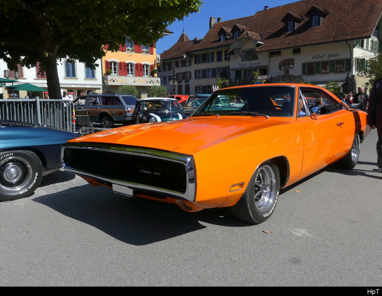 Dodge Charger von 1969 in der Retro Car Show im Einkaufszentrum "Piterlend" in St. Petersburg, 17.2.18
