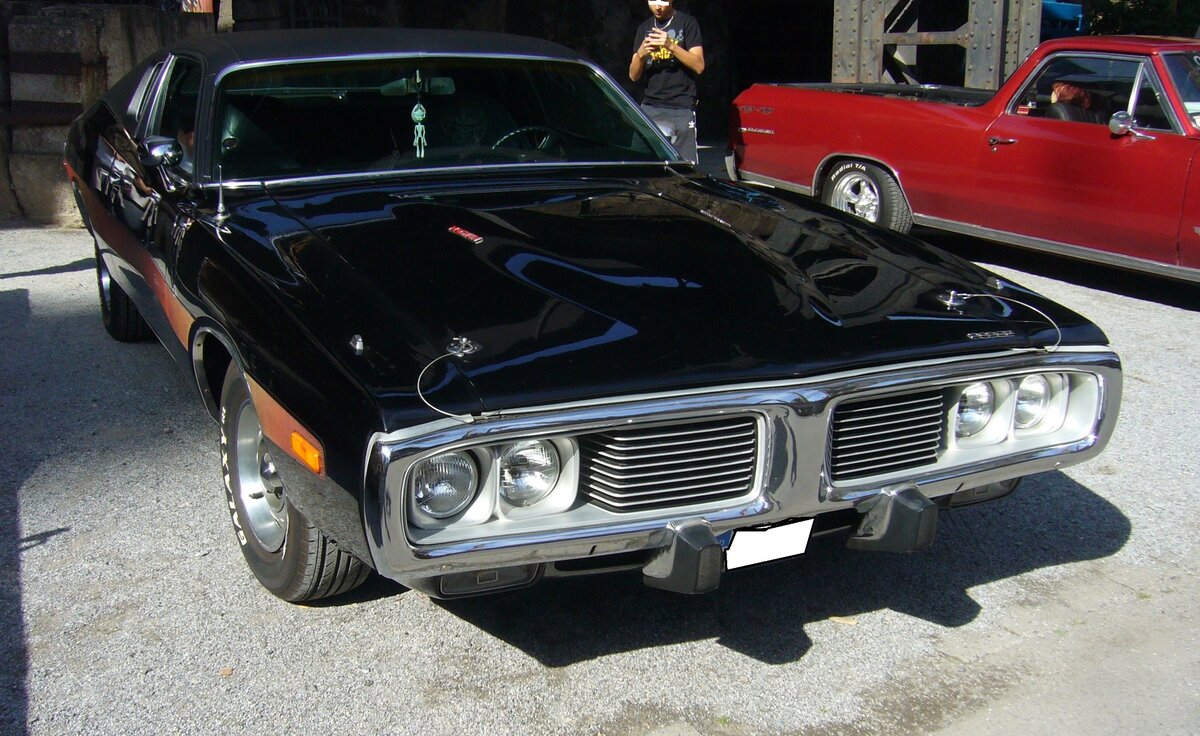 Dodge Charger aus dem Jahr 1974 im Farbton black. Als reines "Muscle Car" stellte Dodge im Jahr 1966 das Coupe-Modell Charger vor. Ab dem Modelljahr 1972 wagte man bei Dodge den Schritt zum luxuriöseren, aber trotzdem stark motorisierten, Coupe. Auch hier konnte der Interessent unter etlichen Motorisierungen zwischen 112 PS aus einem Sechszylinderreihenmotor mit einem Hubraum von 3678 cm³ und etlichen V8-Motoren mit bis zu 7206 cm³ Hubraum und einer Leistung von 335 PS wählen. Altmetall trifft Altmetall am 01.10.2023 im LaPaDu Duisburg.