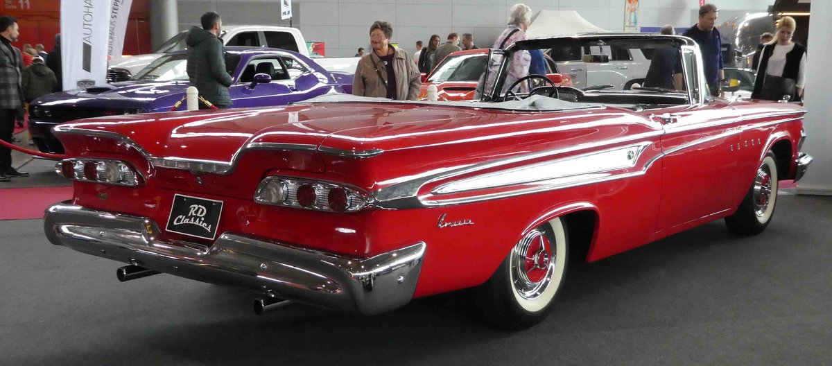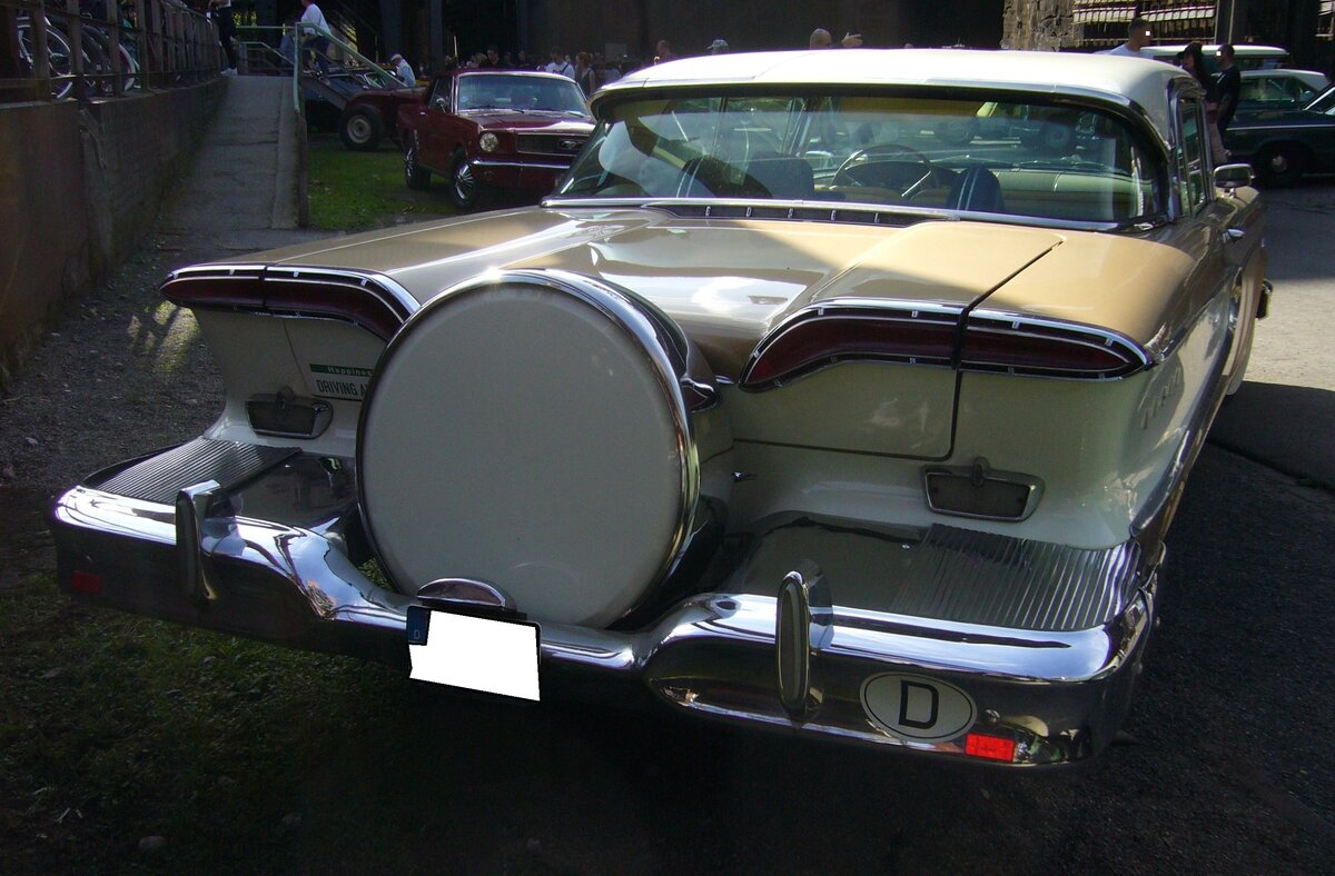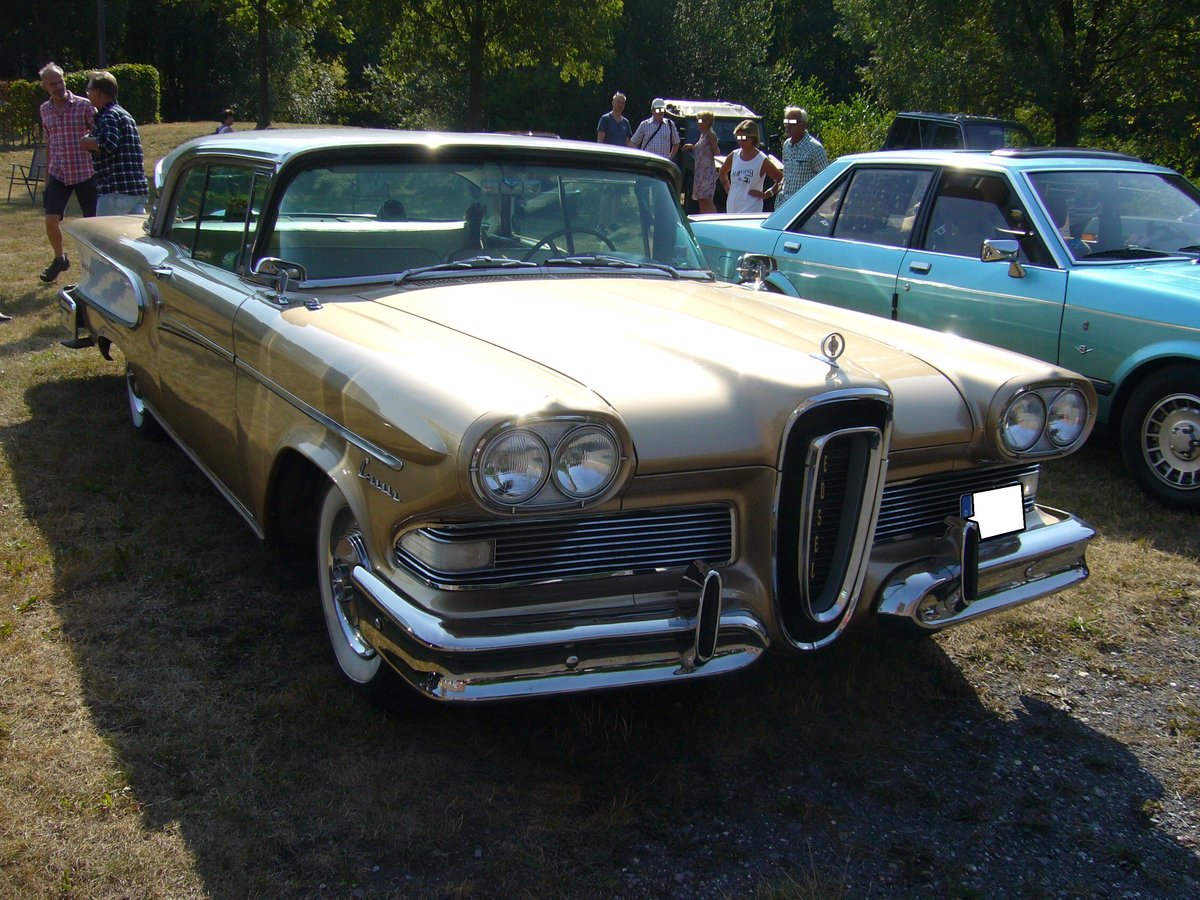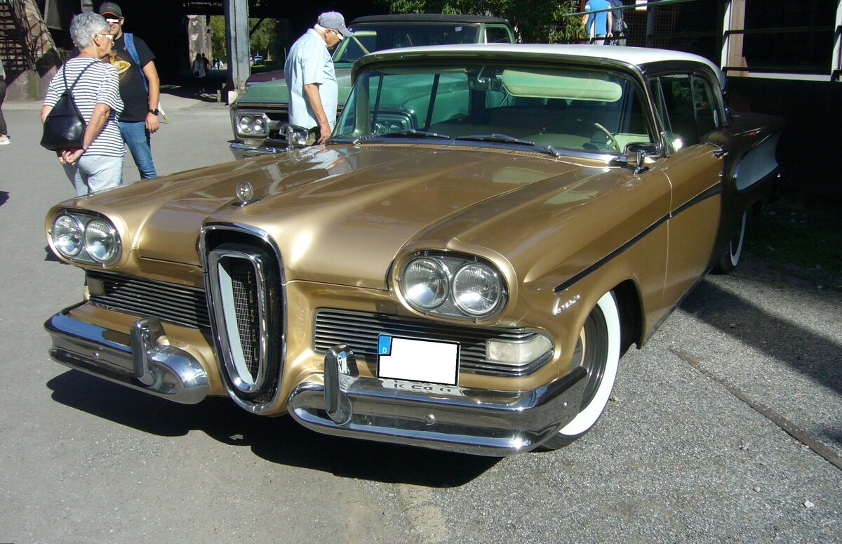 Edsel Corsair twodoor Hardtop Coupe des Modelljahres 1958. Die Corsair Baureihe war die mittlere Baureihe dieses Edsel-Jahrganges. Darunter war der Ranger und darüber der Citation angesiedelt. Das Chassis stammte von der Konzernschwester Mercury. Von dem abgelichteten Modell verkaufte die Edsel-Division im Jahr 1958 3313 Stück. Der Einstiegspreis lag bei US$ 3311,00. Unter der Haube verrichtet ein V8-motor seinen Dienst, der aus 6416 cm³ Hubraum 345 PS leistet. Altmetall trifft Altmetall am 01.10.2023 im LaPaDu Duisburg.