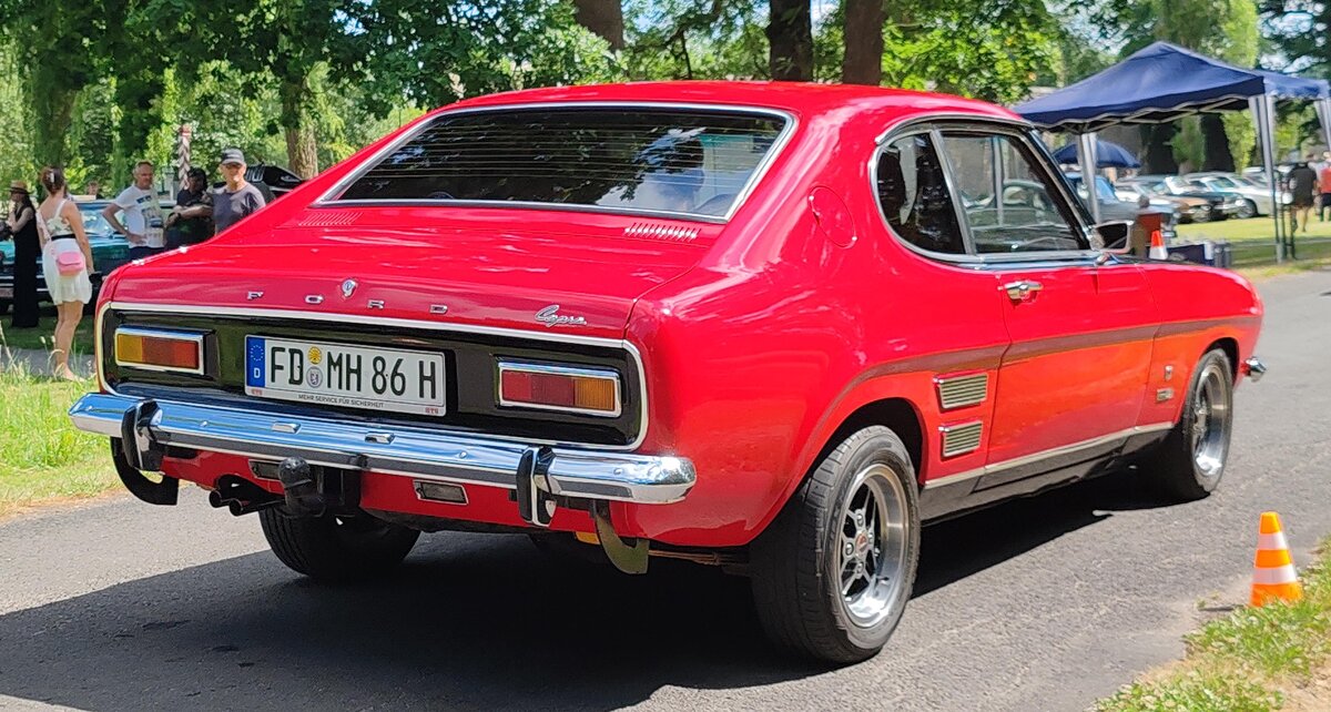 Ford Capri I. 1969 - 1973. Der Capri wurde im Januar 1969 vorgestellt. Bei seiner Einführung waren drei V4-motoren mit 1.3l, 1.5l und 1.7l und zwei V6-motoren mit 2.0l und 2.3l Hubraum lieferbar. Der abgelichtete Capri ist ein 1700 GT im Farbton drachenrot. Er stammt aus dem Jahr 1969 und ist mit dem 1699 cm³ großen V4-motor mit 75 PS motorisiert. Der 1700 GT kostete 1971 DM 8900,00. Oldtimertreffen Nordsternpark Gelsenkirchen am 24.06.2018.
