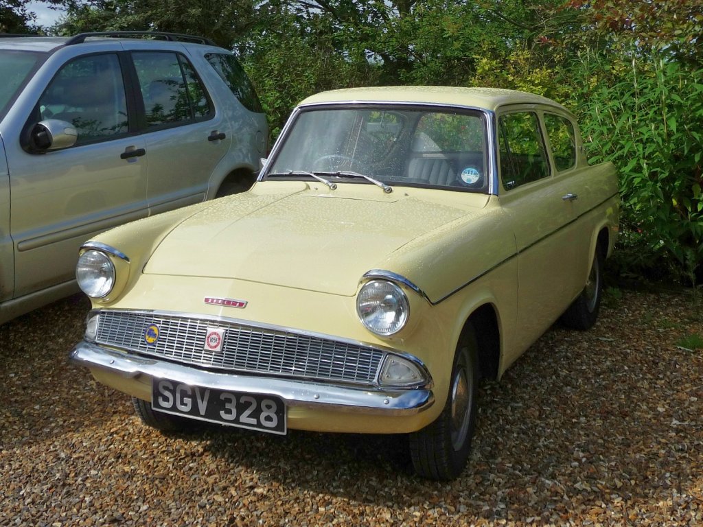 Ein Ford Anglia 105E auf einem Hotelparkplatz im King's Lynn, Norfolk, England.