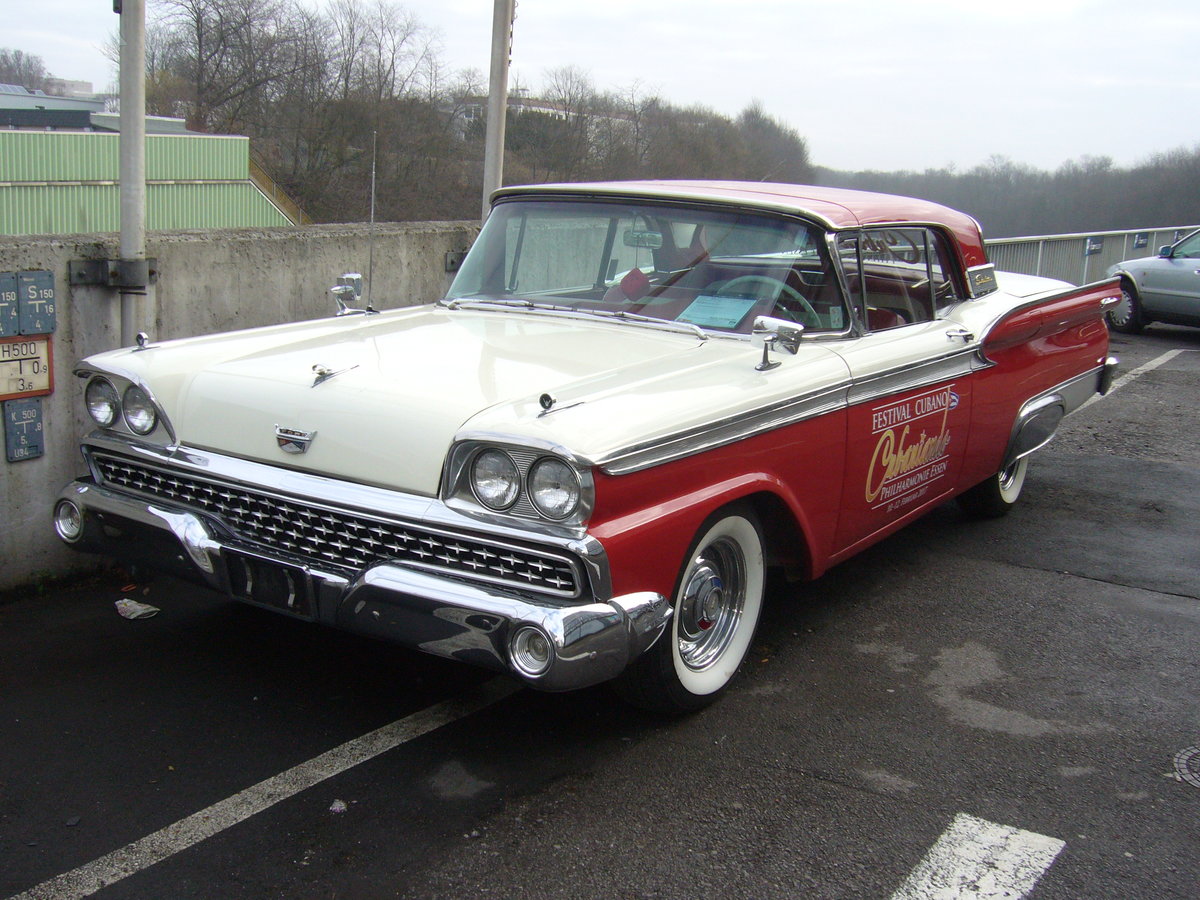Ford Galaxie Skyliner Convertbile des Modelljahres 1959. Der V8-motor dieses Skyliner Convertible hat einen Hubraum von 5.8l und leistet 299 PS. Interessant ist das elektrisch klapp- und versenkbare Coupedach des Skyliner. Neueröffnung eines Essener Oldtimerhändlers am 18.02.2017.