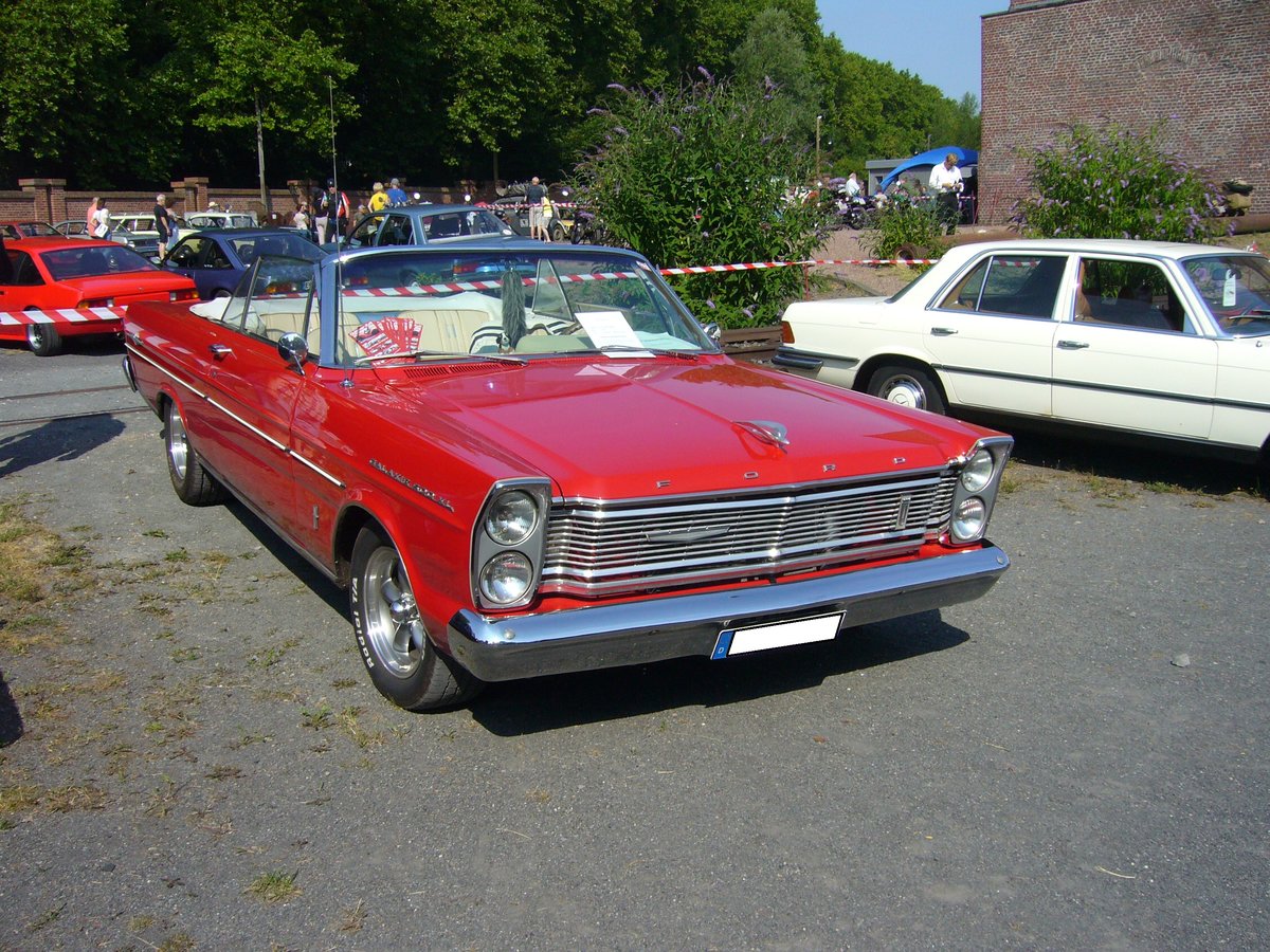 Ford Galaxie 500 XL Sunliner aus dem Modelljahr 1965. Dieses Modell war nach dem Mustang aus dem eigenen Haus und dem Impala von Chevrolet, das dritt häufigst verkaufte Cabrioletmodell in den USA. Dieser, im Farbron rangoon red lackierte Galaxie, wird von einem V8-motor angetrieben, der aus 6391 cm³ Hubraum 300 PS leistet. Oldtimertreffen Zeche Hannover in Herne am 22.07.2018.