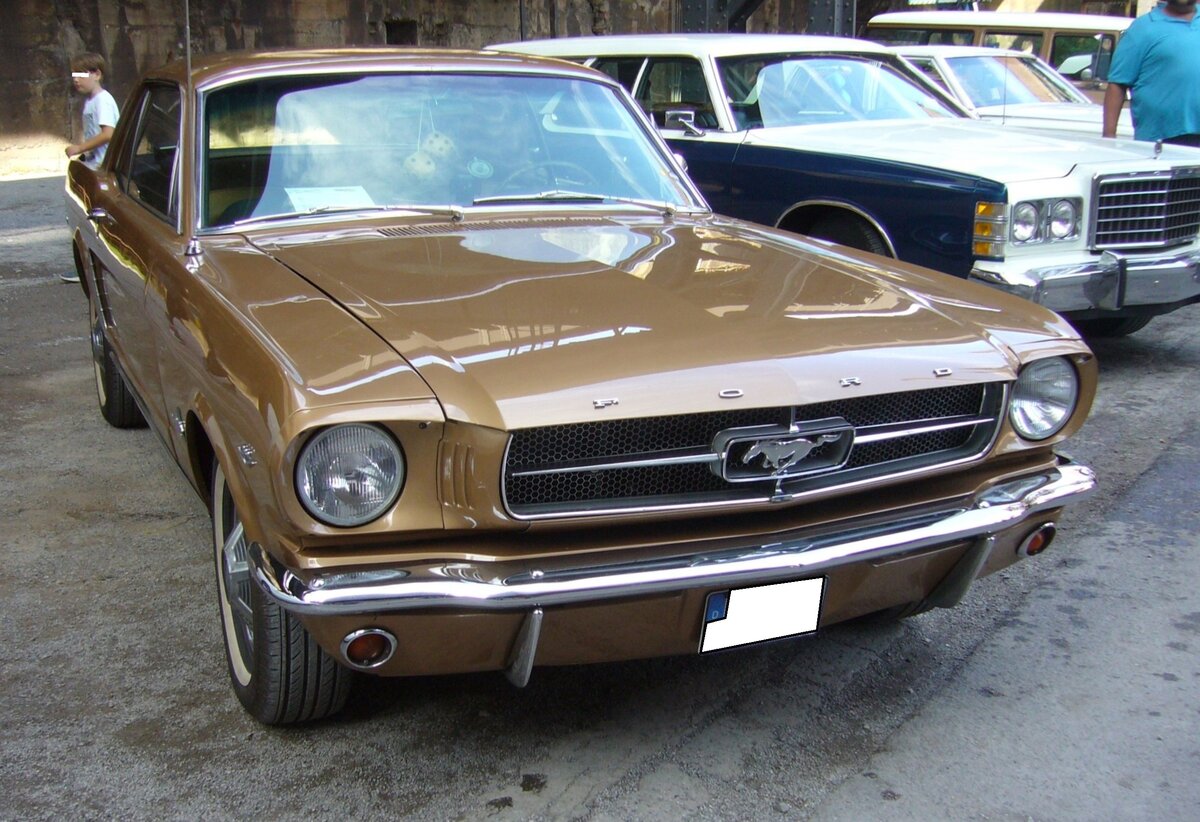 Hier wurde ein 1964´er Ford Mustang in der Karosserievariante Hardtop Coupe, im selten bestellten Farbton prairie bronce, abgelichtet. Der V8-Motor dieses "Ponys" hat einen Hubraum von 289 cui (4736 cm³) und leistet 203 PS. Die Höchstgeschwindigkeit lag, je nach gewähltem Getriebe, zwischen 175 km/h und 185 km/h. Altmetall trifft Altmetall am 01.10.2023 im LaPaDu Duisburg.