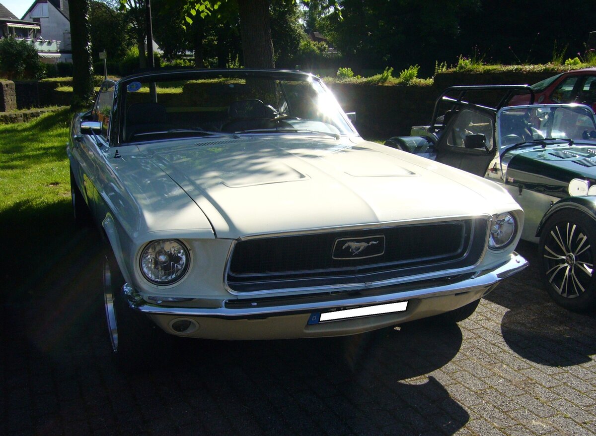Ford Mustang 1 Convertible im Farbton wimbledon white aus dem Jahr 1968. Im Jahr 1968 verkaufte die Ford Motor Company genau 317.404 Fahrzeuge vom Ford Mustang. Davon entfielen 25.376 Stück auf die Karosserieversion Convertible (Cabriolet). Ein solches Cabriolet war ab US$ 2814,00 zu haben. In diesem Modelljahr verbaute Ford als Standardmotorisierung zum ersten mal den neuen 302 cui (4949 cm³) V8-Motor mit einer Leistung von 230 PS. Oldtimertreffen an der Burgruine in Essen-Burgaltendorf am 26.05.2024.