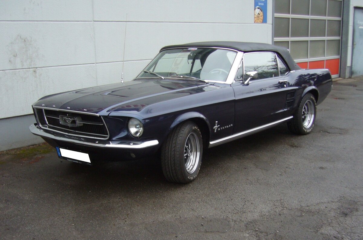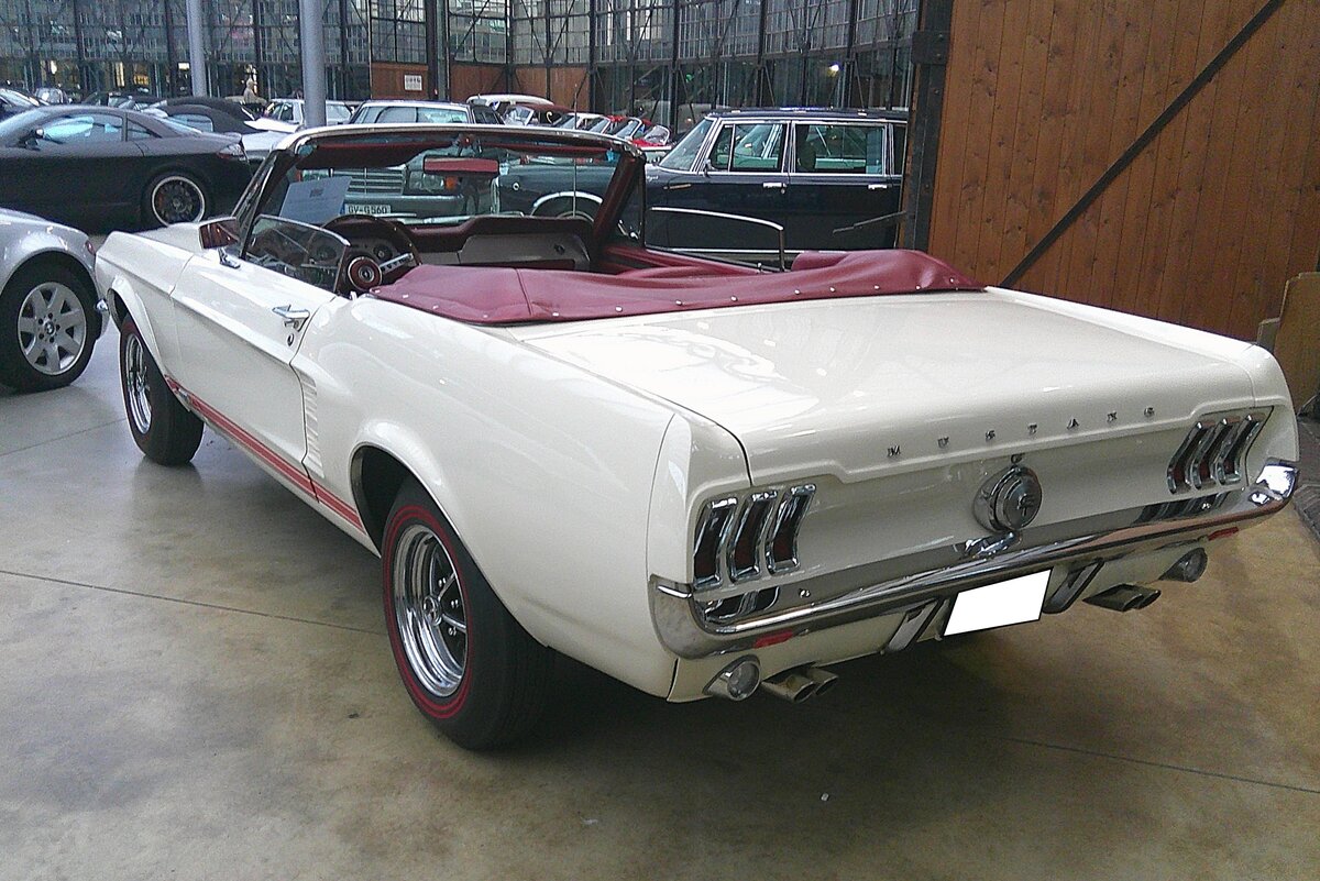 Ford Mustang 1 Convertible im Farbton wimbledon white aus dem Modelljahr 1967. Das gezeigte "Pony" wurde schon mit etlichen aufpreispflichtigen Extras bestellt. Es sind ein Automaticgetriebe, vordere Scheibenbremsen und ein elektrohydraulisches Cabriolet-Verdeck verbaut. Als Motorisierung wählte der Erstbesitzer/in den 289 cui (4735 cm³) mit 200 PS. Classic Remise Düsseldorf am 15.01.2026.
