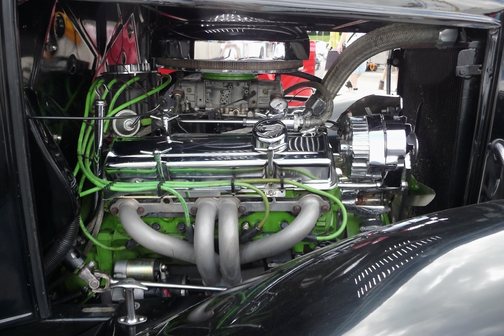 Blick in den Motorraum und die eine Hälfte des V8-Motors des Streetrods auf Basis eines 1932er Ford Modell B.