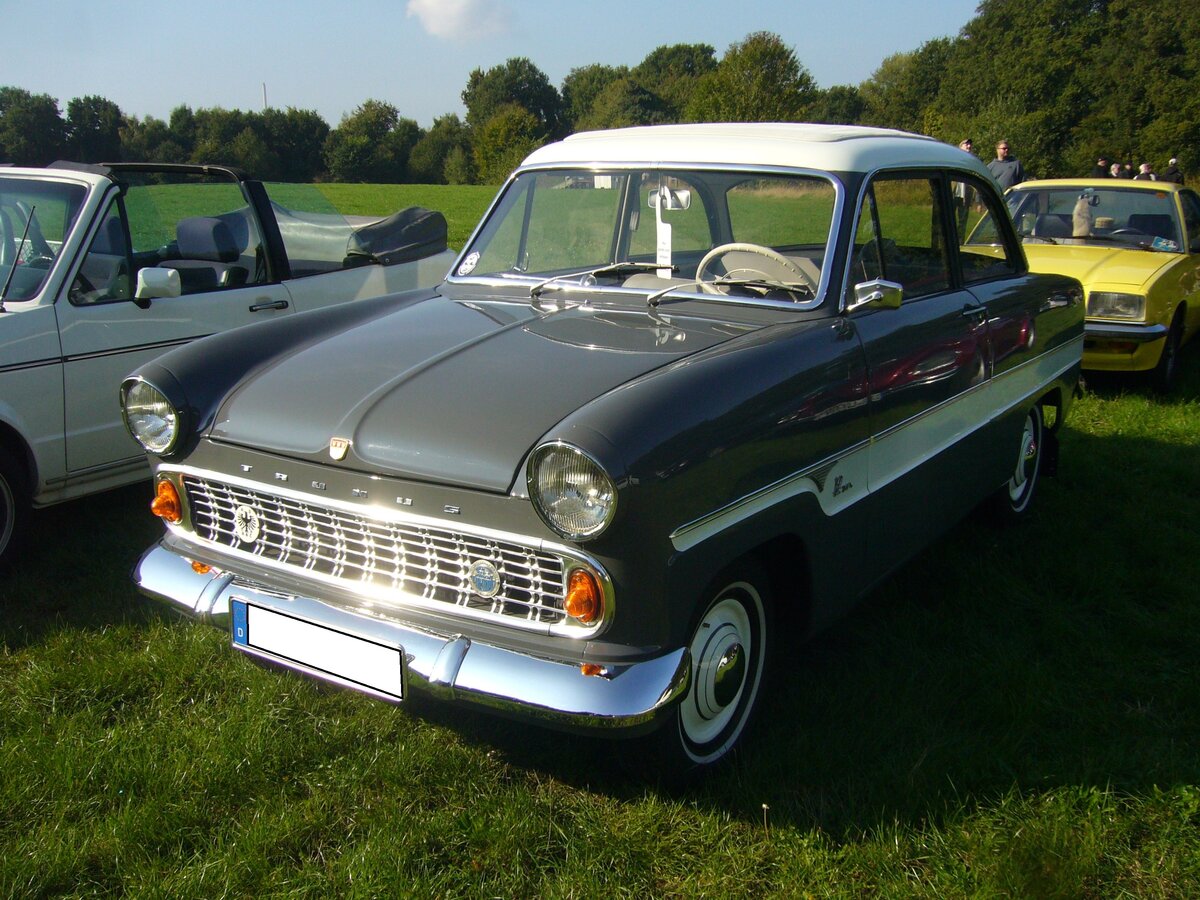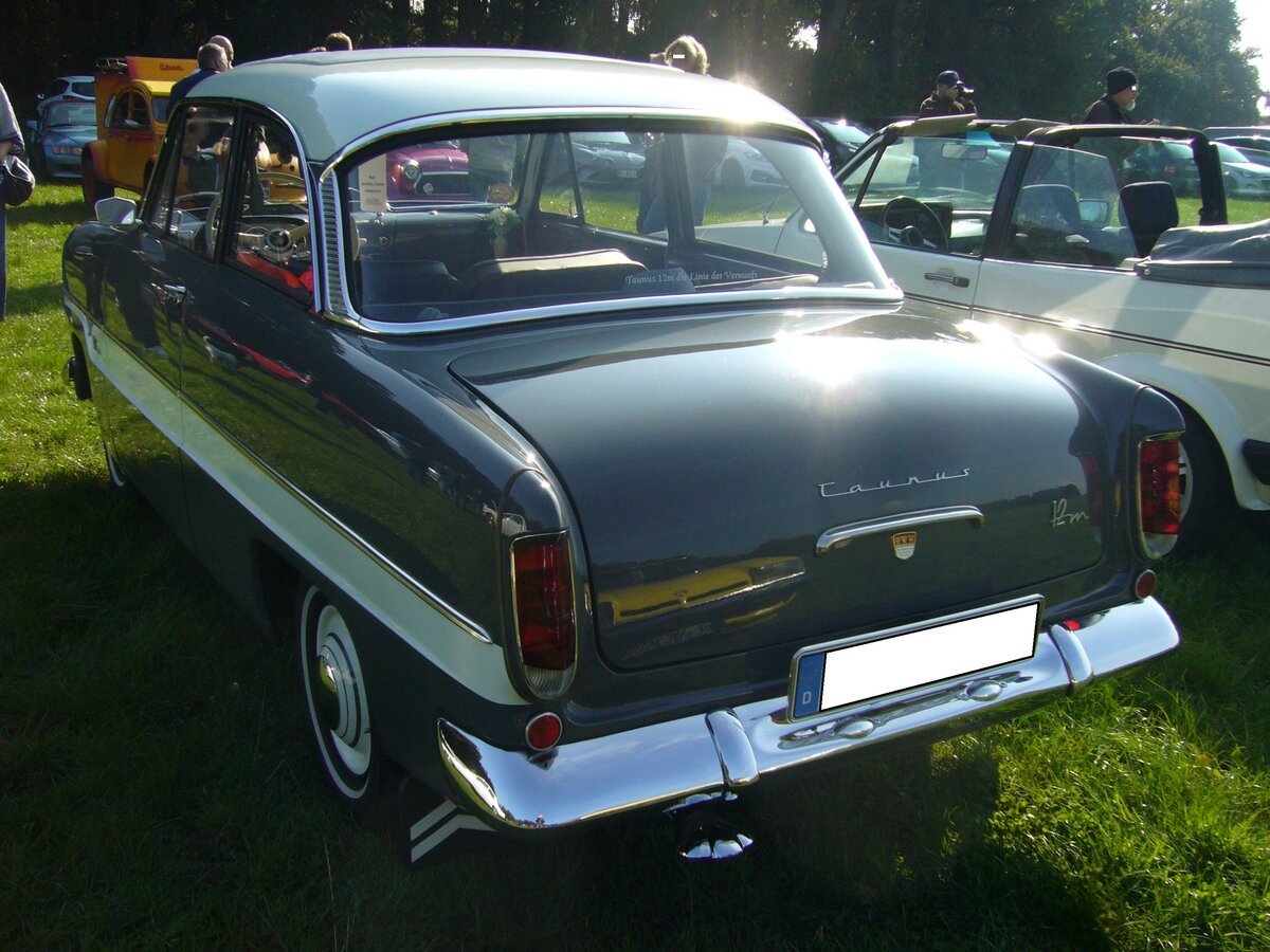 Ford Taunus G13 der vierten Serie. 1959 - 1962. Der im Volksmund "Streifentaunus" genannte G13 basierte auf dem bereits 1952 vorgestellten "Weltkugeltaunus". Lieferbar war dieses Modell mit zwei 4-Zylinderreihenmotoren: 1172 cm³ Hubraum mit 38 PS oder 1498 cm³ mit 55 PS.