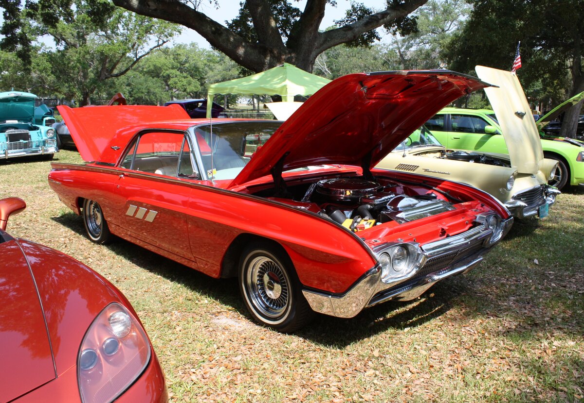 Ford Thunderbird Hardtop Coupe von1963 im Farbton rangoon red. Von dieser Coupe Variante verkaufte Ford in diesem Modelljahr 56.945 Fahrzeuge. Der V8-Motor mit einem Hubraum von 6384 cm³ Hubraum war wahlweise mit 304 PS, 330 PS oder 345 PS lieferbar. Oldtimertreffen der Magnolia Classic Cruiser in Pascagoula/Jackson County/Mississippi im September 2021.