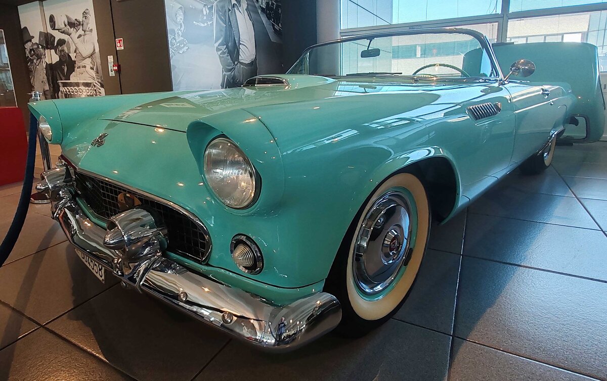 tolle Aufnahme von einem tollen Auto. Ist ganz genau ein T-Bird des Jahrganges 1957. Nur in diesem Modelljahr hatte das Hardtopdach ein Bullauge und das Reserverad war auf dem Kofferraumdeckel montiert.