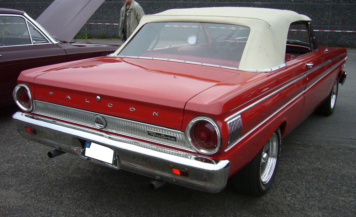 Heckansicht eines Ford Falcon Futura Convertible aus dem Modelljahr 1964 im Farbton rangoon red. Oldtimer- und Youngtimertreffen an Mo´s Bikertreff in Krefeld am 08.10.2023.