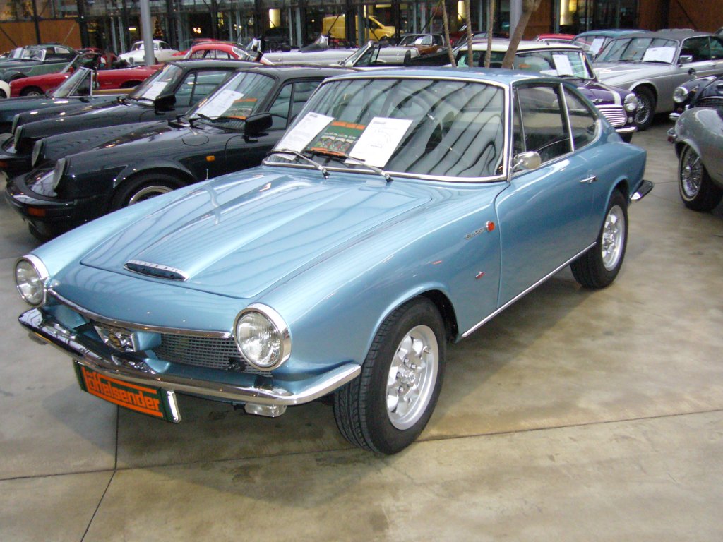 Glast 1700 GT. 1965 - 1967. Der 1700 GT wurde nur 1.427 mal verkauft, während sein kleinerer "Bruder" 1300 GT, es auf 3.949 Exemplare brachte. Die Karosserie stammte von Frua aus Turin. Der 4-Zylinderreihenmotor mit 1.682 cm³ leistete 100 PS und verhalf dem schnittigen Auto zu einer Höchstgeschwindigkeit von 183 km/h. Das abgelichtete Auto entstammt dem Baujahr 1966 und lief den Großteil seines Autolebens in Mexiko, als Dienstwagen des deutschen Botschafters. Meilenwerk Düsseldorf 12.12.2010.