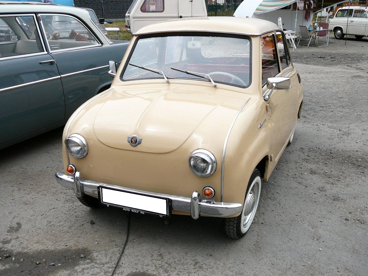 Glas Goggomobil T250 Limousine, gebaut von 1955 bis 1969 in Dingolfing. Vorgestellt wurde die winzige Limousine im Herbst 1954. Im Februar 1955 begann bei der Hans Glas GmbH die Serienfertigung. Der Wagen war auch als T300 und ab 1957 als T400 lieferbar. Mehr als 75% der Fahrzeuge wurden allerdings mit dem 250 cm³ Motor ausgeliefert. Diese Tatsache war den vielen Inhabern des "alten" Führerscheines der Klasse IV geschuldet. Hier handelt es sich um eine Limousine die nach 1964 produziert wurde. Dieses ist an den vorn angeschlagenen Türen zu erkennen. Der im Heck verbaute, gebläsegekühlte Zweizylinderzweitaktmotor hat beim 250´er einen Hubraum von 247 cm³ und leistet 13,6 PS. Oldtimertreffen an der "alten Dreherei" In Mülheim an der Ruhr im Juni 2015.