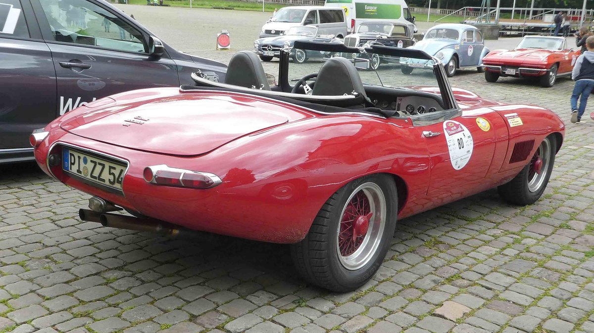 =Jaguar E, Bj. 1964, 4235 ccm, 210 PS, steht in Fulda anl. der SACHS-FRANKEN-CLASSIC im Juni 2019