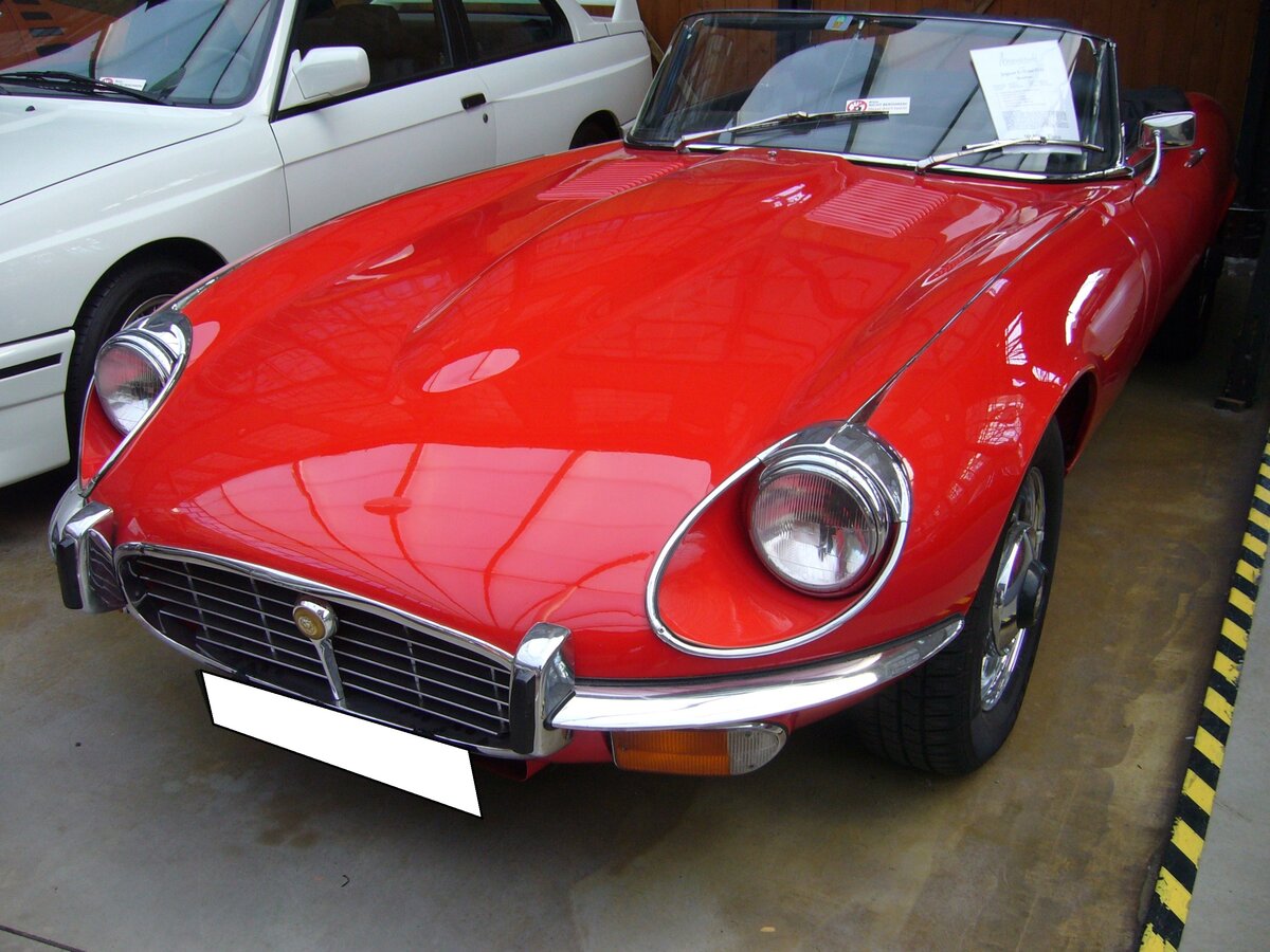 aguar E-Type Series 3 Roadster. Der E Type, ein Klassiker par excellence im Farbton signal red. Vorgestellt wurde das Modell auf dem Genfer Salon des Jahres 1961. Wie schon 13 Jahre zuvor der XK120 stieß auch der E Type in der Fachpresse auf einhellige Begeisterung. Sowohl Cabriolet, als auch das FHC (Fixed Head Coupe) genannte, geschlossene Modell waren sofort der Traumwagen der breiten, automobilen Masse. Die Series 3 Modelle waren die letzte Baureihe des legendären Jaguar E-Type und wurden von 1971 bis 1974 produziert. Der V12-Motor leistet 267 PS aus einem Hubraum von 5343 cm³. Classic Remise Düsseldorf am 12.09.2022.