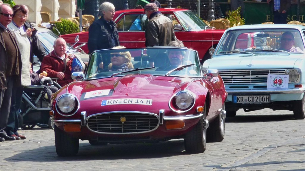 In der Startaufstellung warten hinter dem Jaguar E-Type Cabrio noch ein Opel Kadett und ein Mercedes -8.