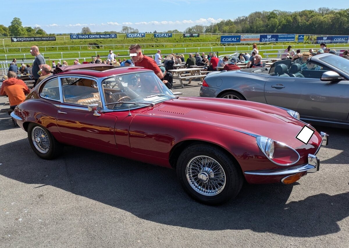 Jaguar E Type Series 3 Coupe aus dem Jahr 1971 im Farbton regency red. Produziert wurde das Modell in den Jahren von 1971 bis 1974. Vorgestellt wurde der E Type auf dem Genfer Salon des Jahres 1961. Wie schon 13 Jahre zuvor, beim Jaguar XK120, stieß auch der E Type in der Fachpresse auf einhellige Begeisterung. Sowohl Cabriolet, als auch das FHC (F ixed H ead C oupe) genannte, geschlossene Coupe-Modell waren sofort der Traumwagen der breiten, automobilen Masse. Der E Type wurde in drei Serien hergestellt. Die Serien 1 und 2 wurden von Sechszylinderreihenmotoren angetrieben. Die seit 1971 produzierte Series 3 war mit einem V12-Motor ausgerüstet, der aus einem Hubraum von 5343 cm³ 275 PS leistet. Classic car show at Chepstow race course/South Wales am 27. April 2025. Michael H.