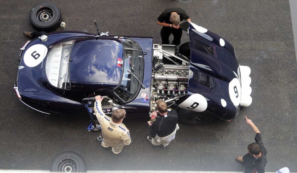 Schrauber arbeiten an einem JAGUAR E Type beim SPA SIX HOURS Endurance Race am 20 September 2014 in Spa Francorchamps. Gesehen vom F1 Boxendach