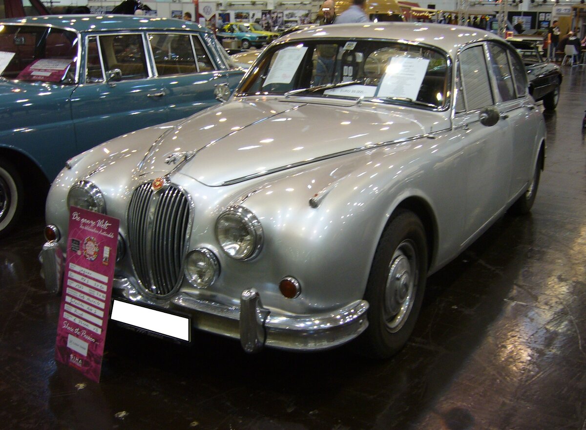 Jaguar MK II 3.4 Litre, gebaut von 1959 bis 1968 in Coventry. Für das Modell MK2 gab es drei Motorisierungsvarianten: 2.4 Litre mit 120 PS, den hier abgelichteten 3.4 Litre mit einem Hubraum von 3442 cm³ und einer Leistung von 210 PS und den 3.8 Litre mit 220 PS. Der gezeigte MK2 3.4 Litre aus dem Jahr 1967 ist im Farbton silver grey lackiert. Techno Classica Essen am 06.04.2024.