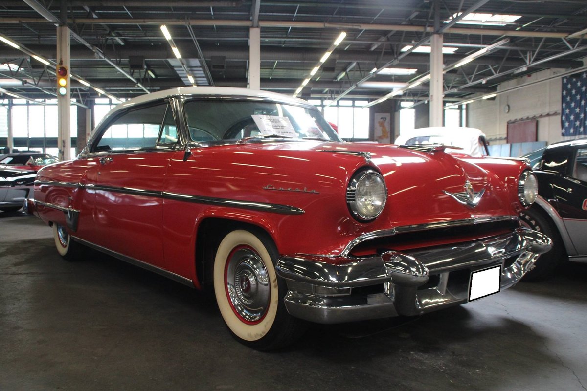 Lincoln Capri Hardtop Coupe aus dem Modelljahr 1954 im Farbton regalred. Von diesem Modell verkaufte die Lincoln-Division im Jahr 1954 exakt 14.003 Fahrzeuge. Der Grundpreis lag bei US$ 3869,00. Der V8-Motor hat einen Hubraum von genau 5200 cm³ und leistet 205 PS. Emmerich im Sommer 2017.