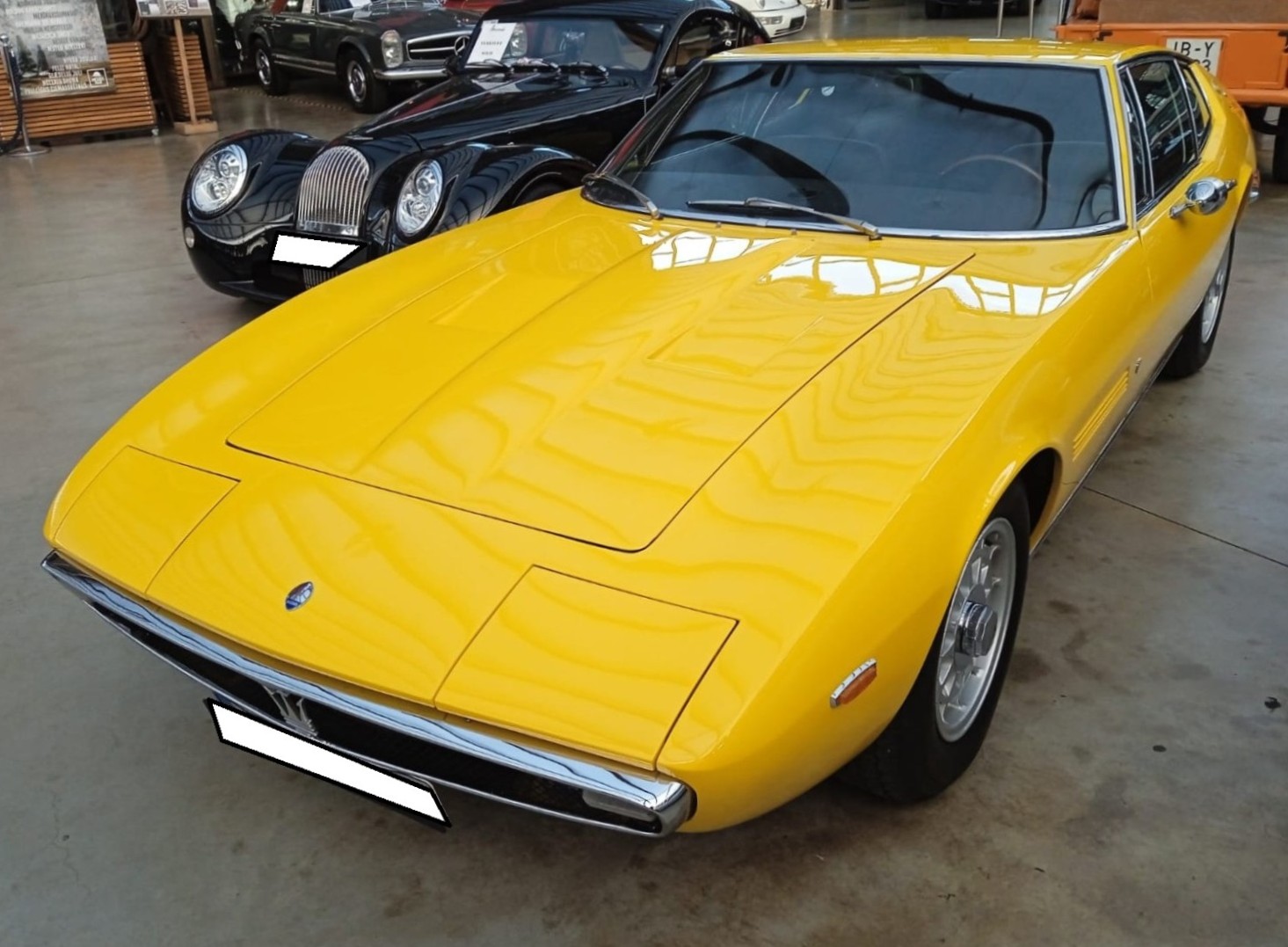 Maserati Ghibli Coupe aus dem Jahr 1971. Produziert wurde der "Ghibli", benannt nach einem Sahara-Wüstenwind, in den Jahren von 1966 bis 1973. Das gezeigte Coupe im Farbton nero wird von einem V8-Motor mit einem Hubraum von 4719 cm³ und einer Leistung von 330 PS angetrieben. Diese Motorleistung verhilft dem Wagen zu einer Höchstgeschwindigkeit von 280 km/h. Insgesamt wurden 1.124 Coupe-Modelle und 125 Ghibli Cabriolet-Modelle produziert. Classic Remise Düsseldorf am 11.01.2025.