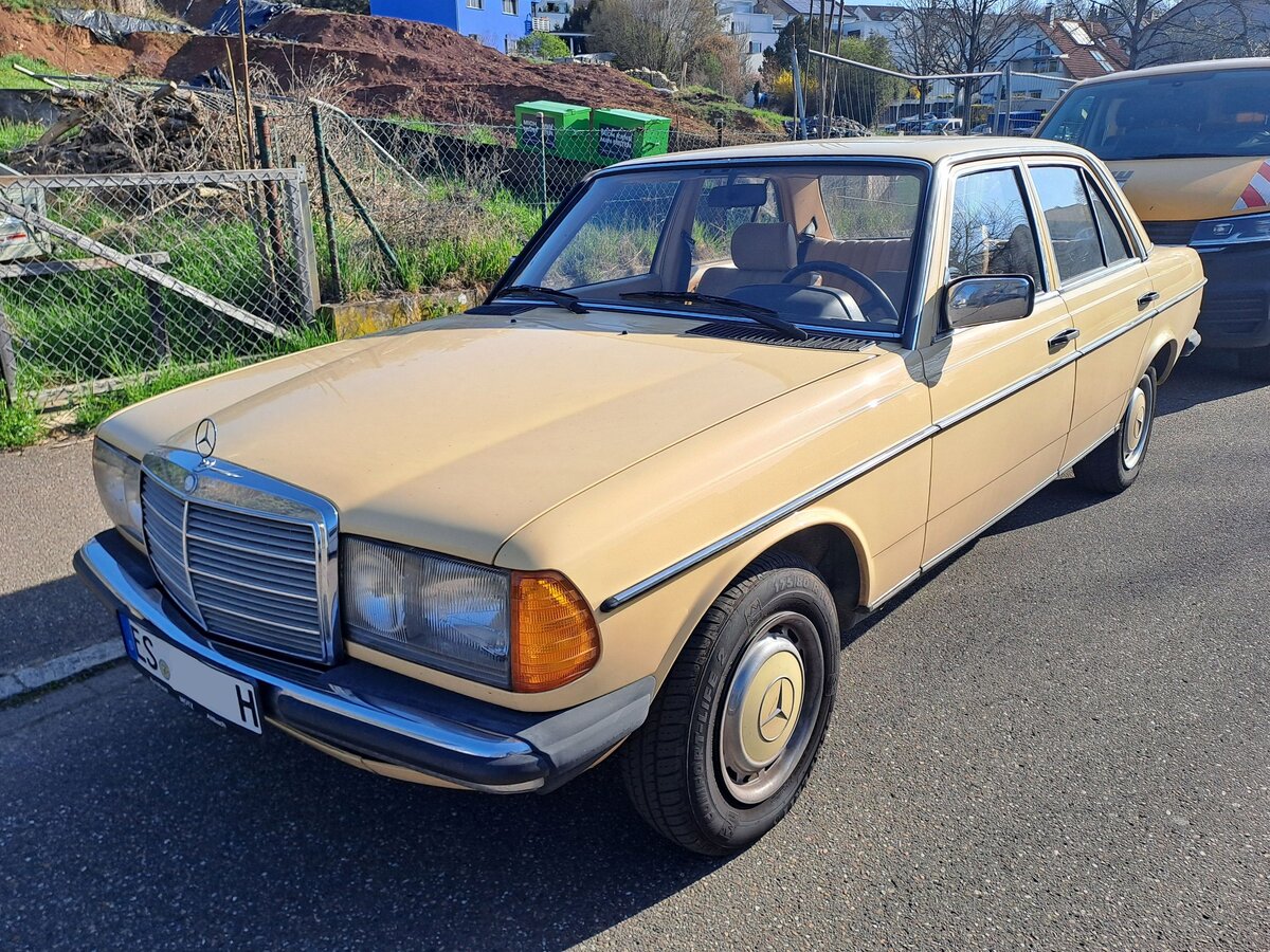 Mercedes-Benz E-Klasse W123, mitgezogen am 1. Mai 2025 auf der Zufahrt zum Oldtimer Frühlingserwachen beim Sportpark Loherhof Geilenkirchen