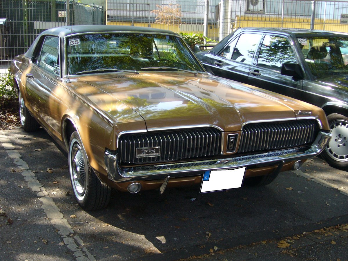 Mercury Cougar des Modelljahres 1967 im Farbton cinnamon frost. Im Grunde war der Cougar eine luxuriöse Version, des bereits zwei Jahre zuvor vorgestellten Ford Mustang. Der Cougar war wahlweise mit zwei V8-Motoren lieferbar: 4735 cm³ mit 200 PS oder 6384 cm³ mit 324 PS. 11. Dukes of Downtown am 31.08.2019 in Essen-Rüttenscheid.