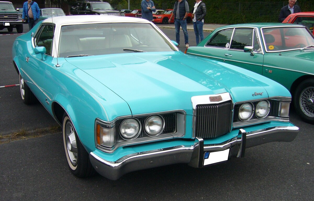 Mercury Cougar XR7 Coupe aus dem Modelljahr 1973. Angetrieben wird das Auto, das nach einem nordamerikanischen Berglöwen benannt ist, von einem V8-Motor mit einem Hubraum von 5769 cm³ und einer Leistung von 270 PS. Oldtimer- und Youngtimertreffen an Mo´s Bikertreff in Krefeld am 08.10.2023.