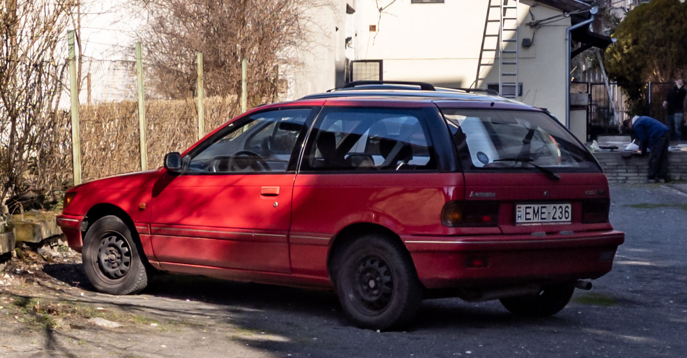 Rückansicht / Seitenansicht: dreitürer Mitsubishi Colt der fünften Generation. Foto: Februar, 2022.