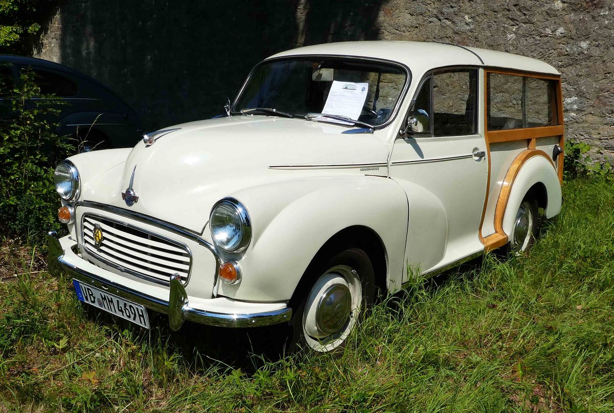 =Morris Minor Traveller, Bj. 1969, 1098 ccm, 50 PS, ausgestellt bei Blech & Barock im Juli 2018 auf dem Gelände von Schloß Fasanerie bei Eichenzell